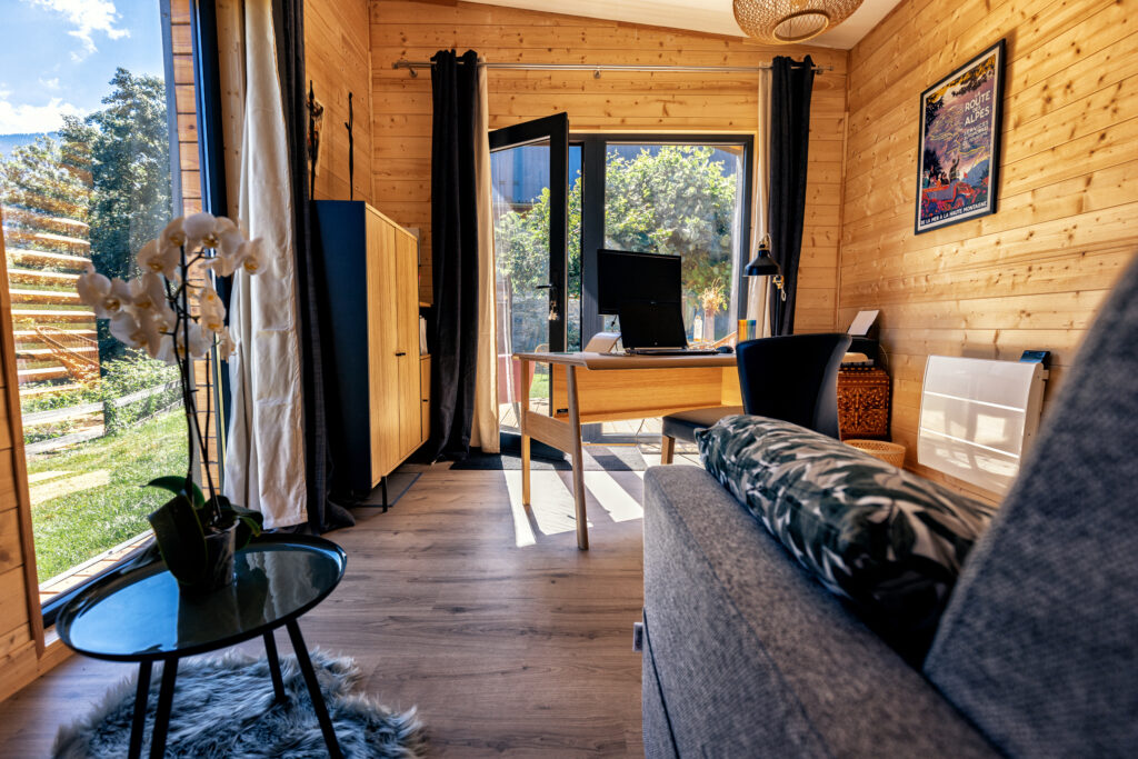 Niché à 900m d’altitude sur les hauteurs du village de Theys, au cœur du Massif de Belledonne, je vous ouvre mon studio de jardin : conçu sur le principe des tiny house ou lodge, vous trouverez dans cet espace propice à la réflexion et à l’écriture, intimité, quiétude et vue sur les montagnes.